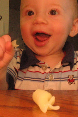 "Oishii. Pasta suki!" says Owen, drawing from his Japanese roots. He's really starting to make his way towards being a toddler. Mobility and accomplishing 'things' seem to be his focus.
